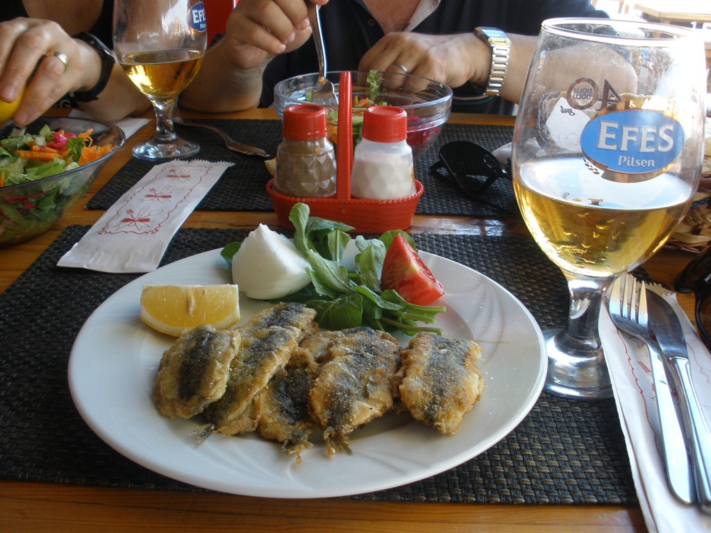 Translated it is “Sugar Almonds.”  It reminded me of a lighter version on peanut brittle with fresh almonds.  Delicious.  After walking about the town, we headed back to the harbor, hungry and thirsty.  One of Datça’s mainstays is fishing, so we had to stop by and grab some fresh fish…and cold beer.